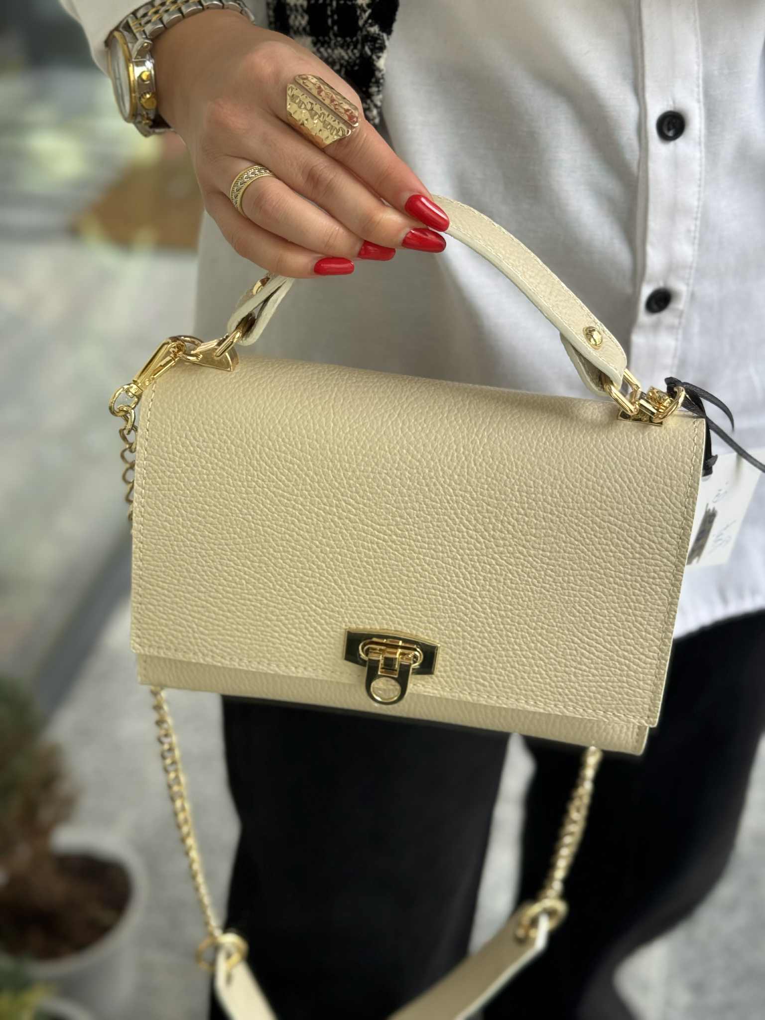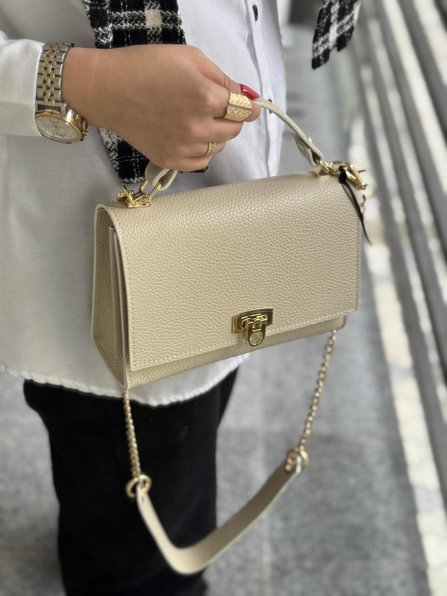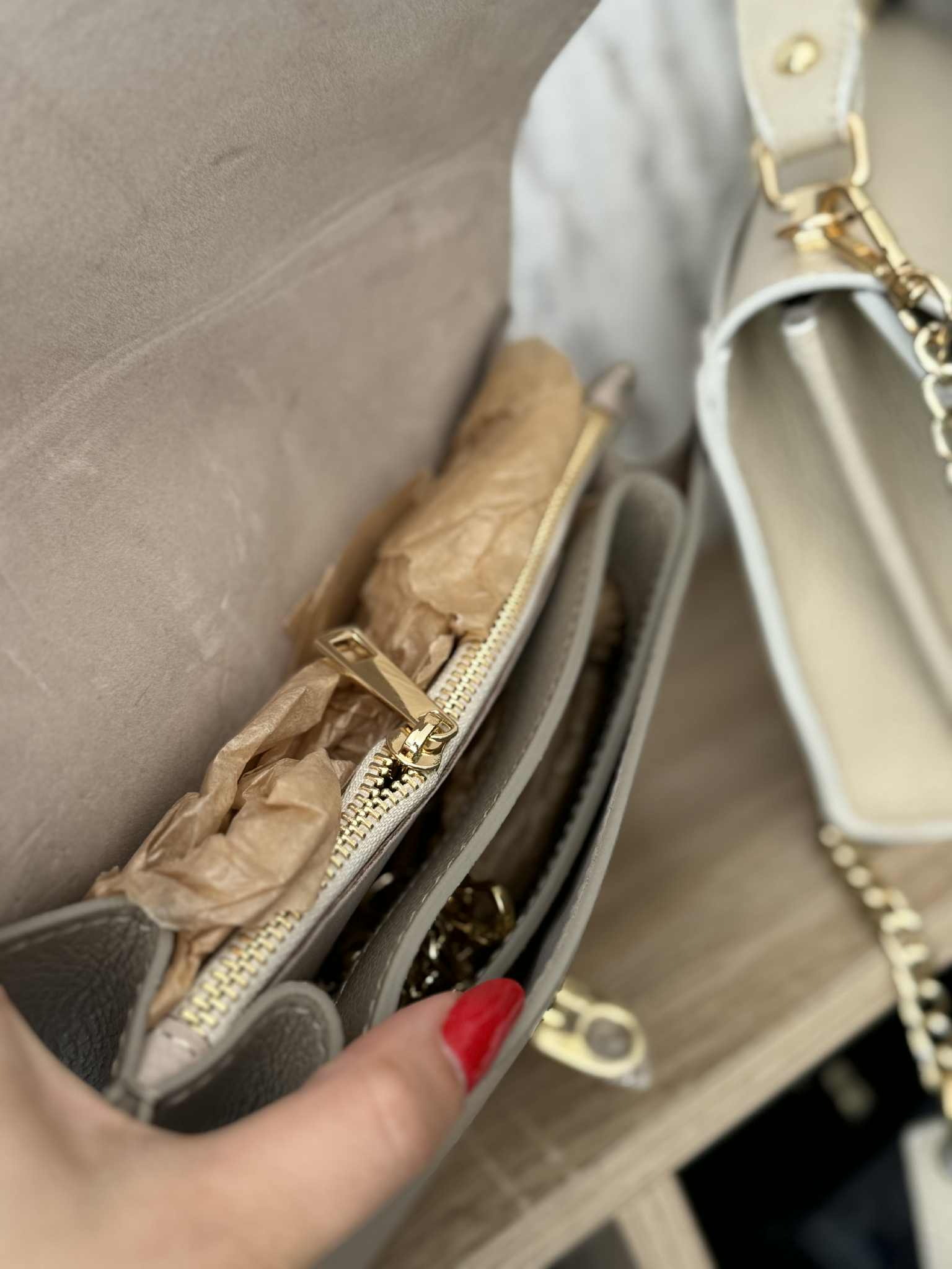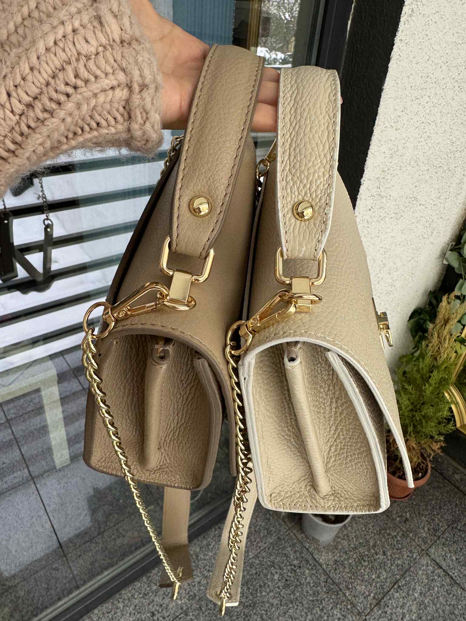👉In partea superioară se inchide cu o clapeta din piele prevăzută cu un accesoriu metalic. In interior are un compartiment generos , impartit in 3 -unul dintre ele cu fermoar