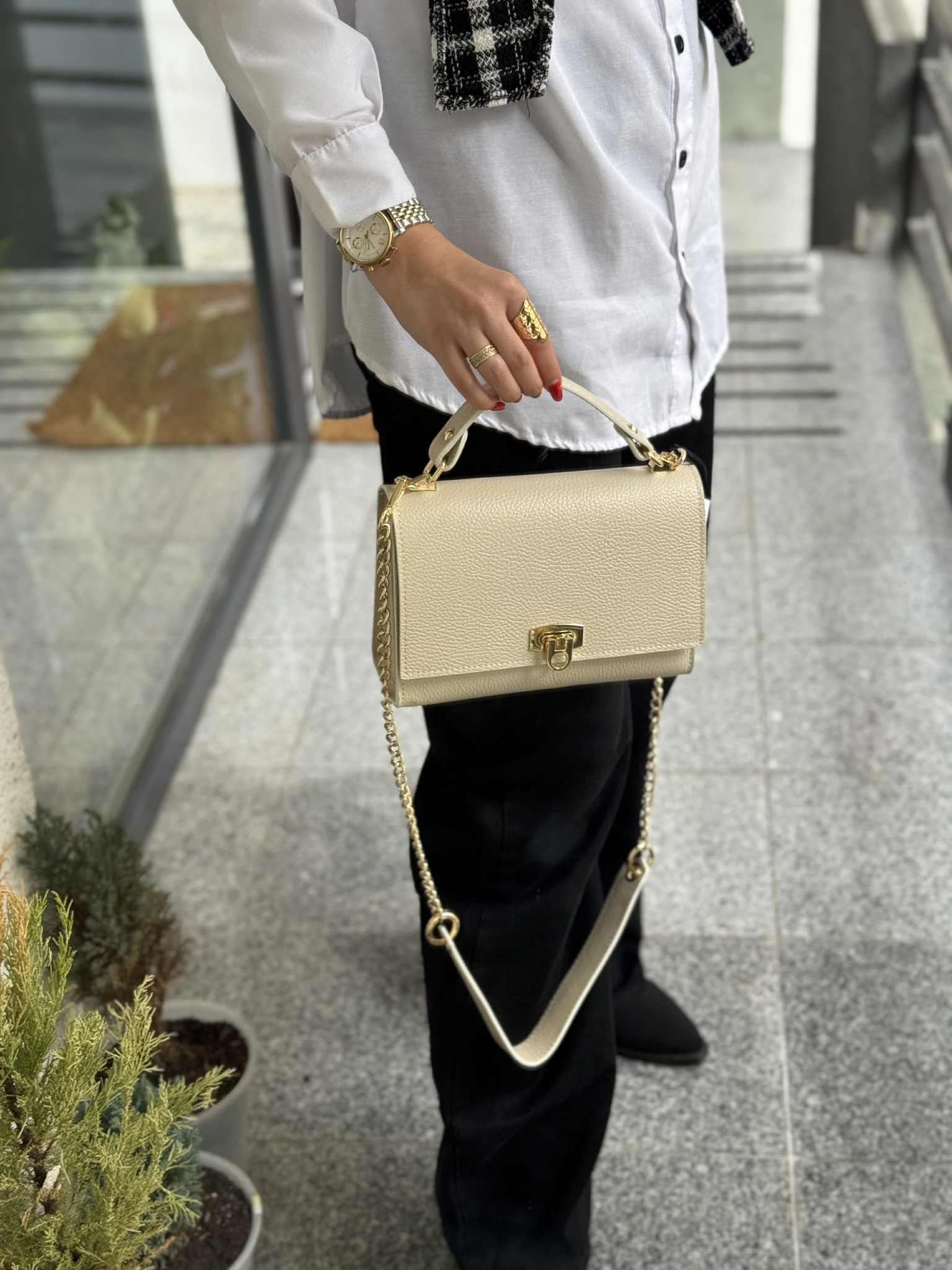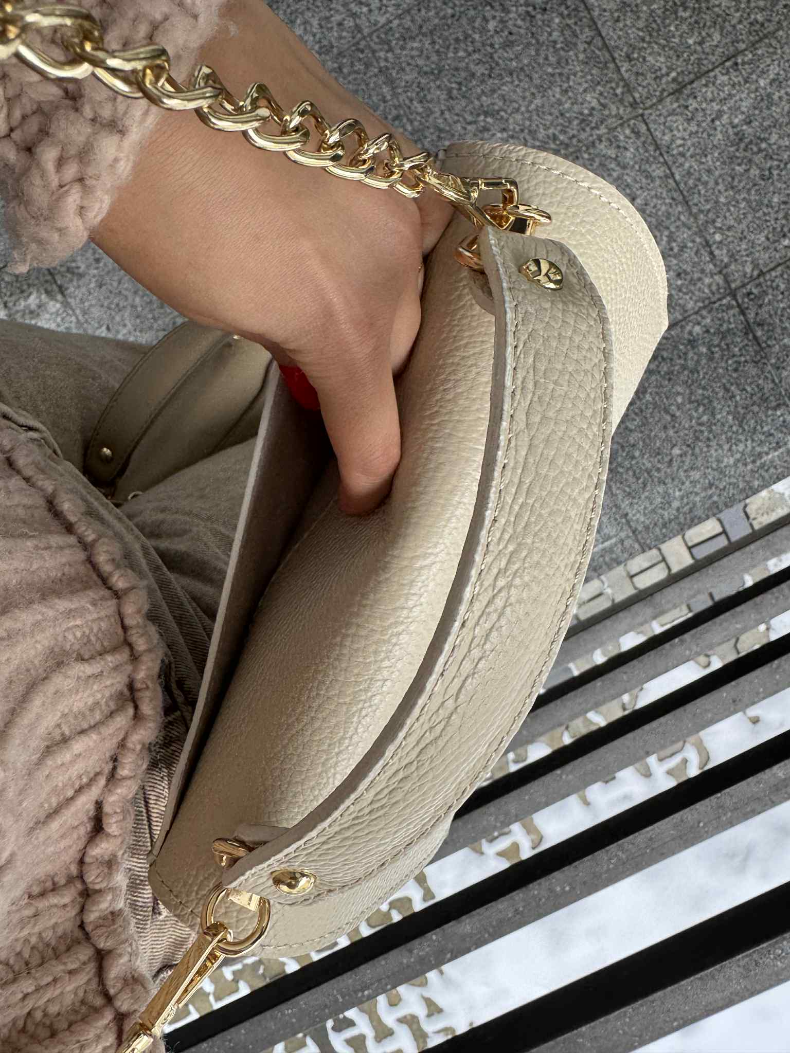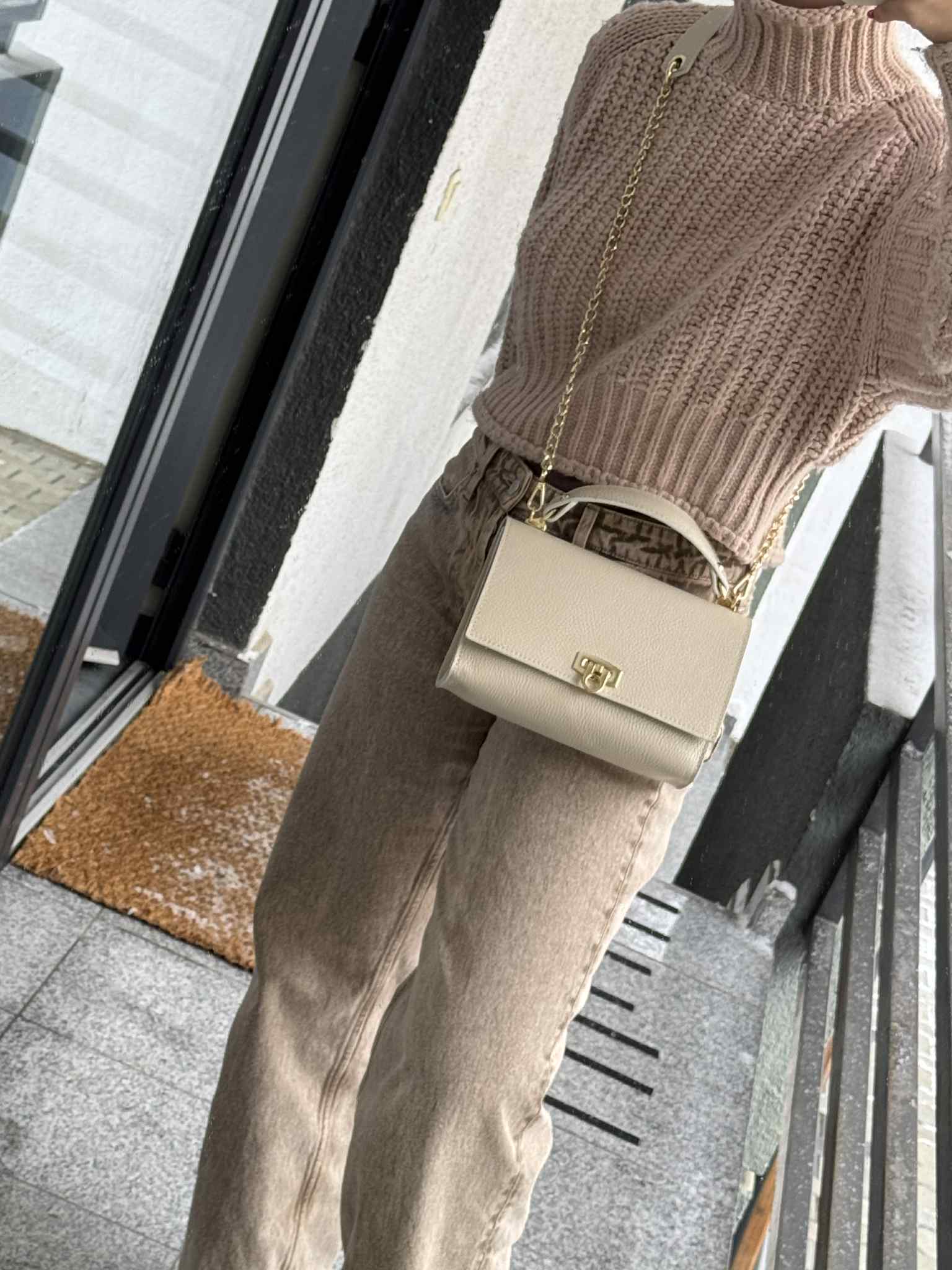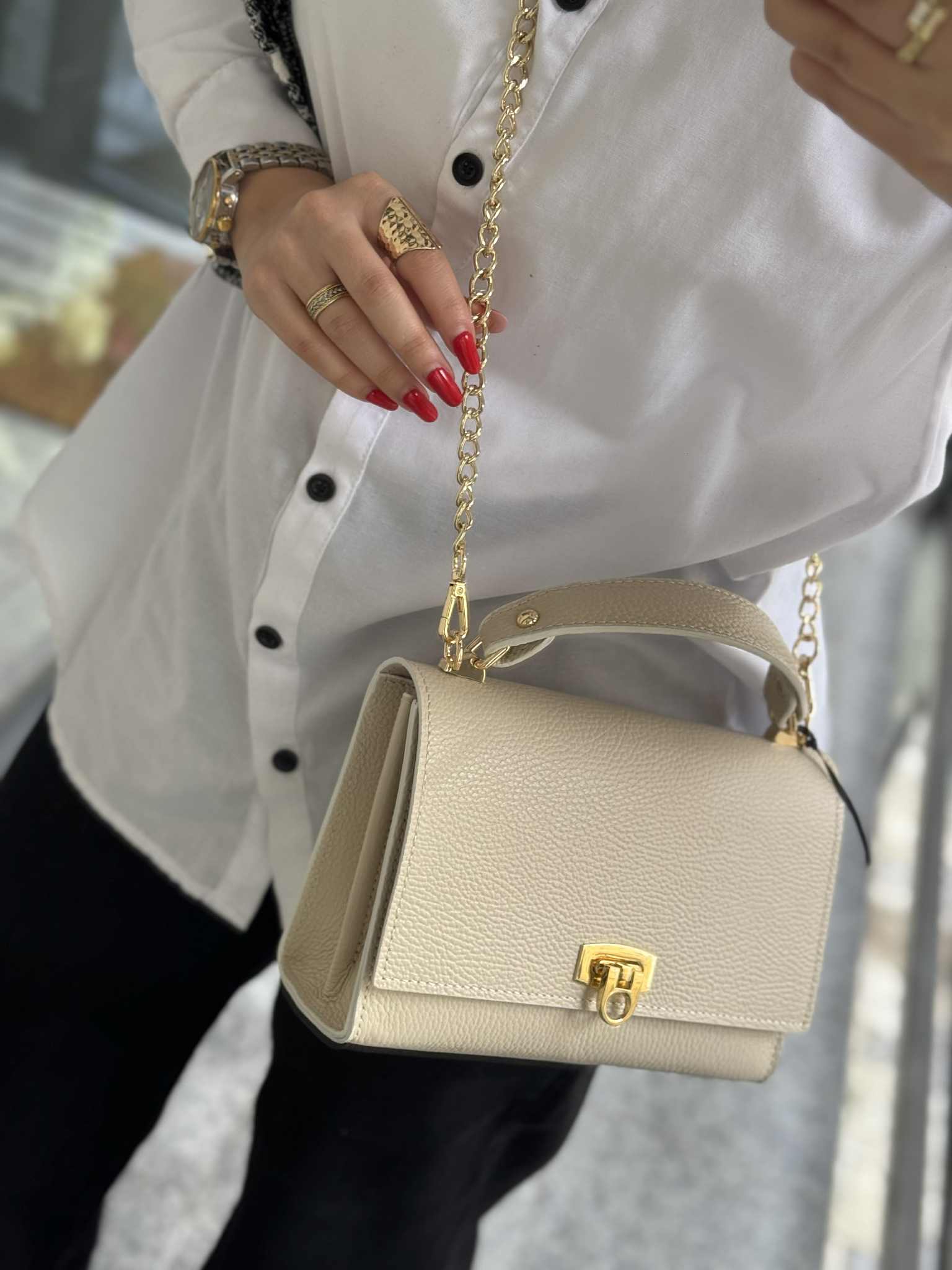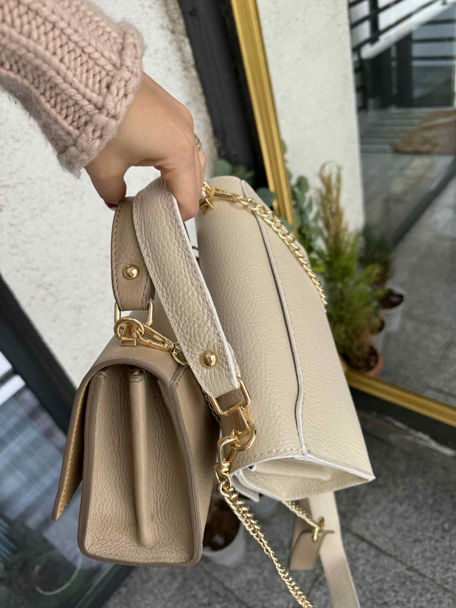👉In partea superioară se inchide cu o clapeta din piele prevăzută cu un accesoriu metalic. In interior are un compartiment generos , impartit in 3 -unul dintre ele cu fermoar