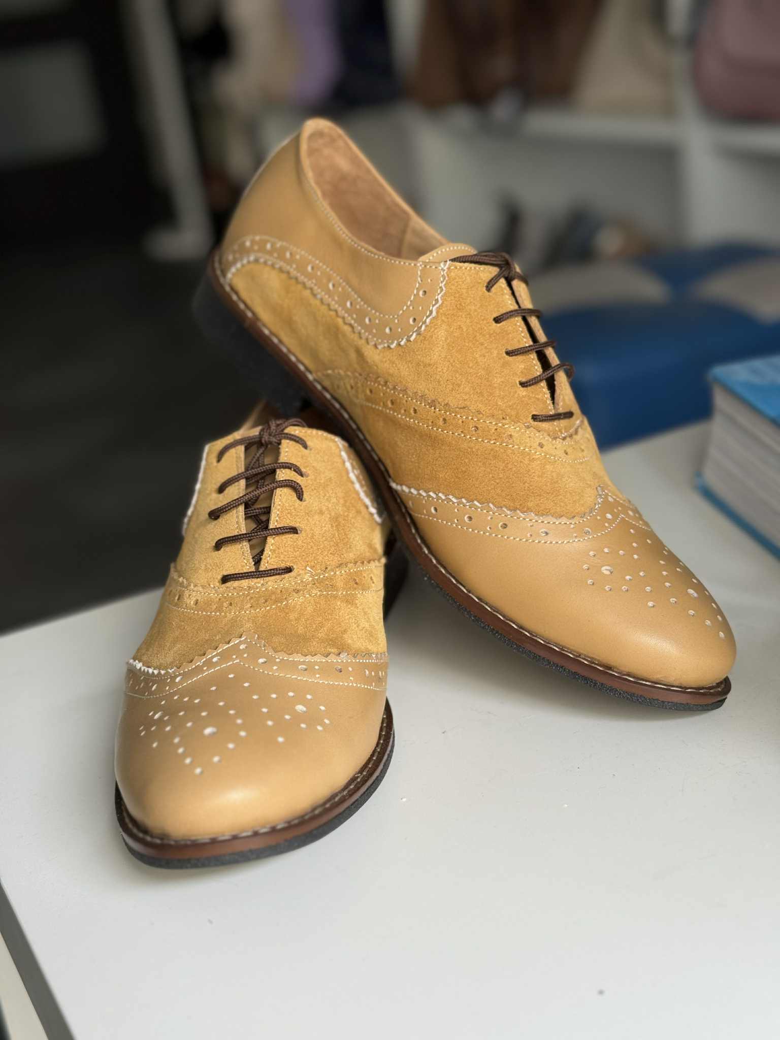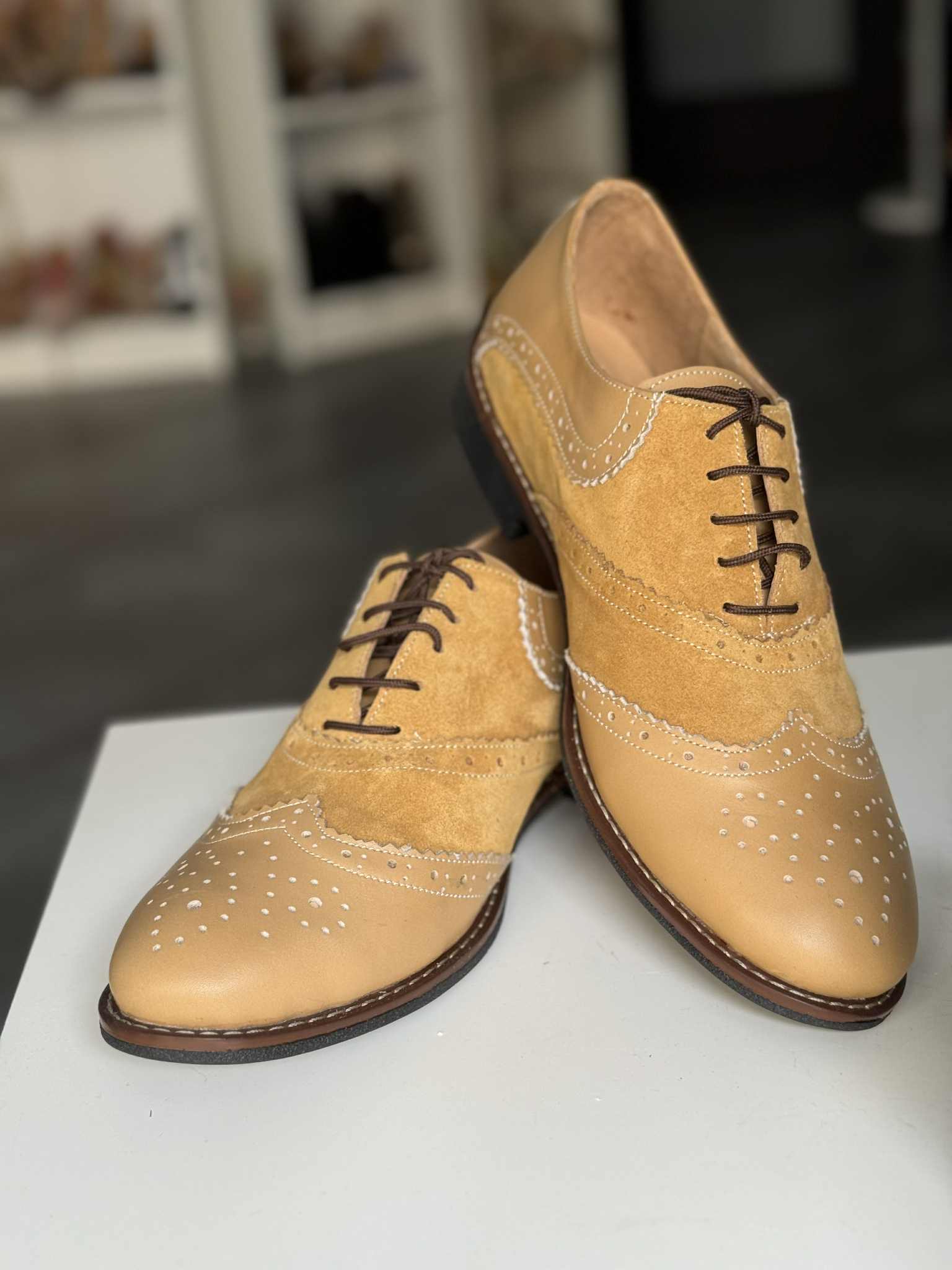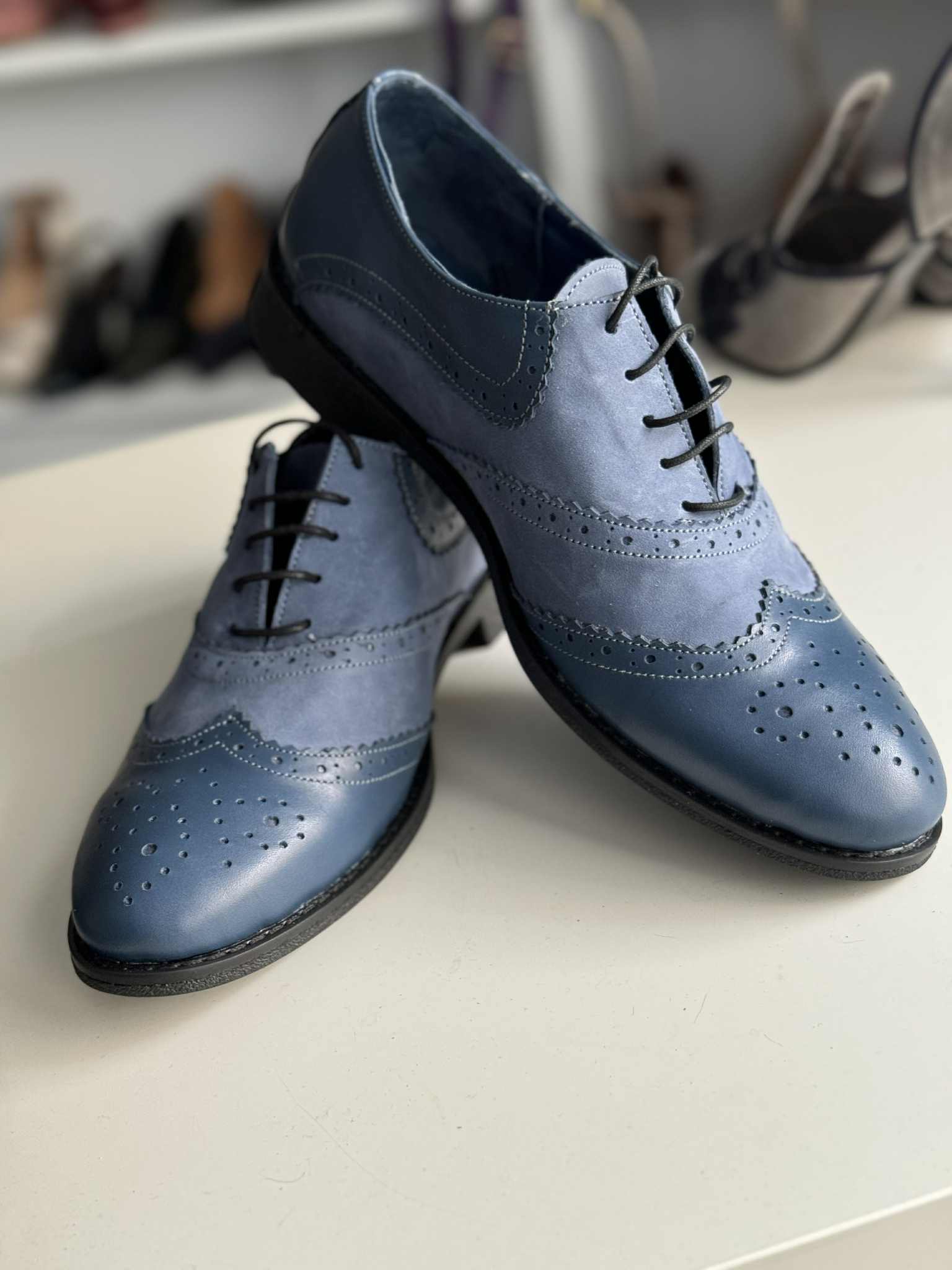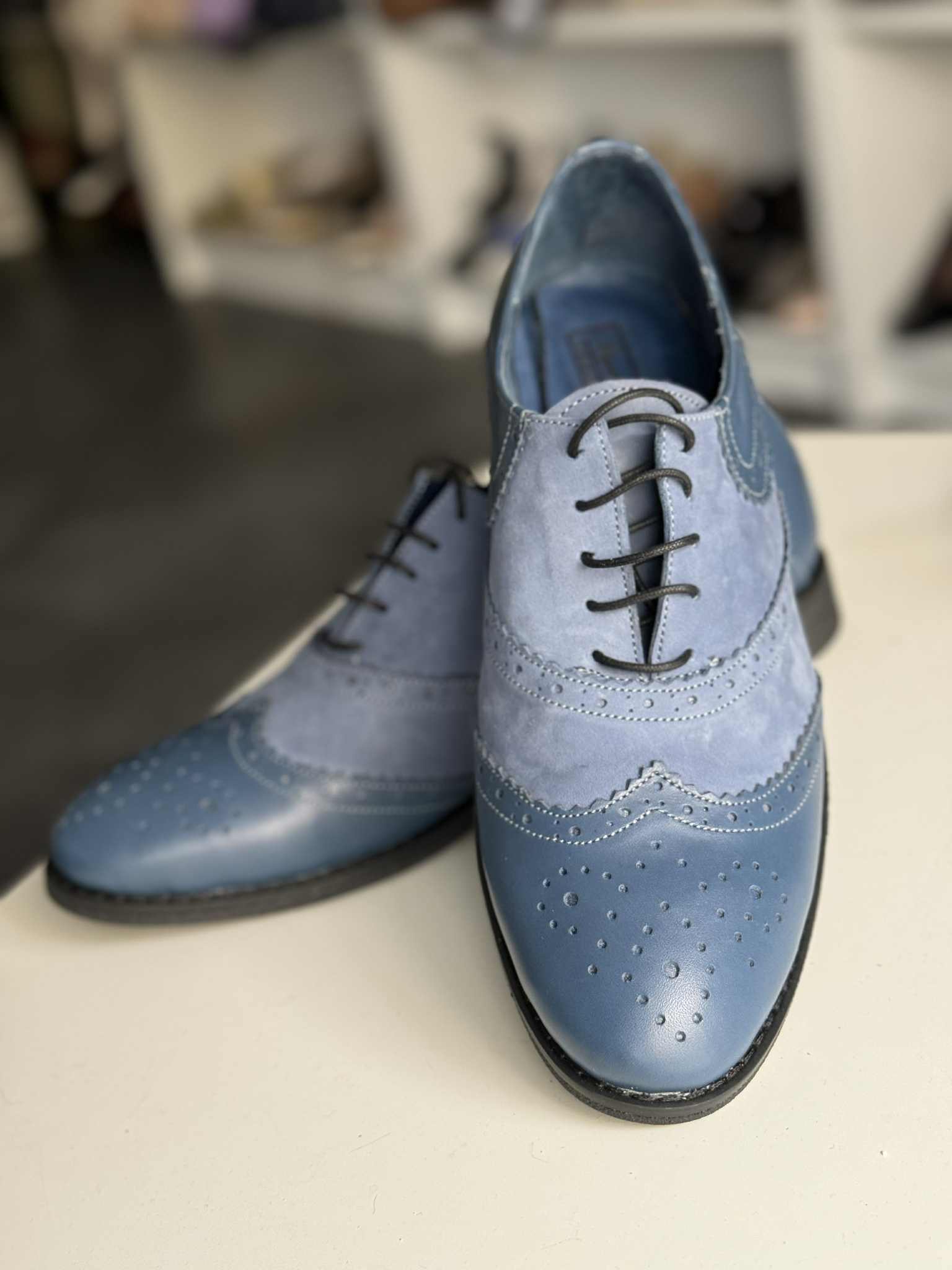 Pantofii ii putem confectiona din orice culoare sau combinatie de culori si din orice tip de piele (box, piele intoarsa, piele lacuita).